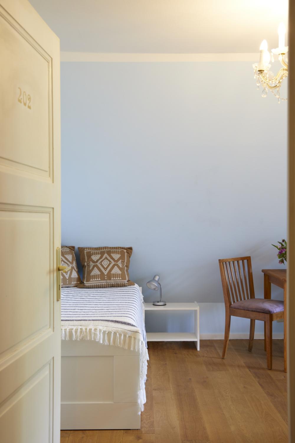 Dieses in hellem Blau gehaltene schöne Zimmer mit Südfenster und Gartenblick verfügt wie alle Zimmer im 2. Stock über im Jahr 2022 eingebaute massive Eichendielen.