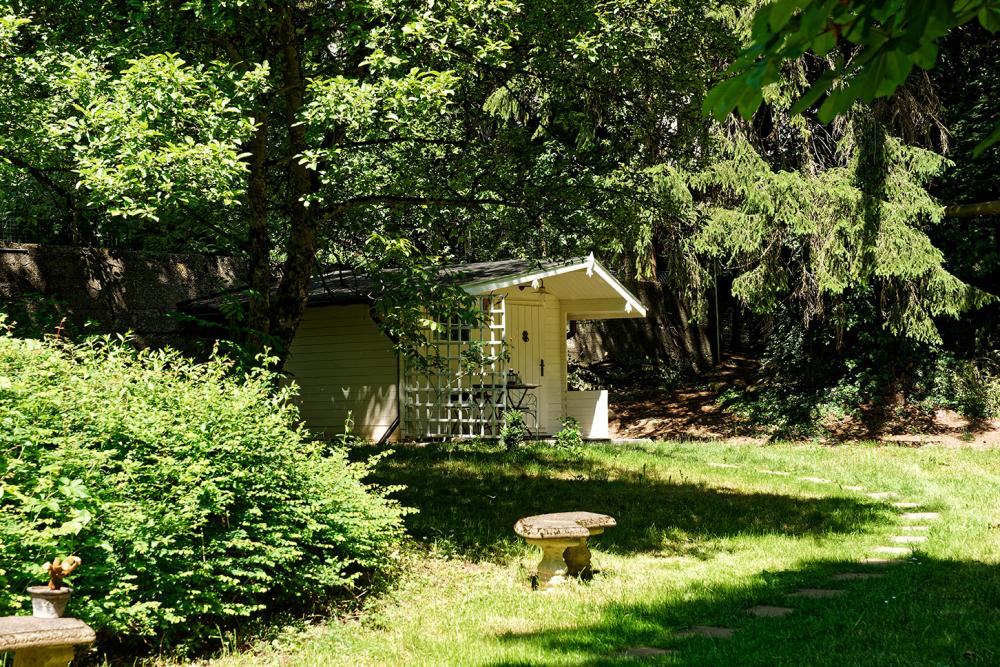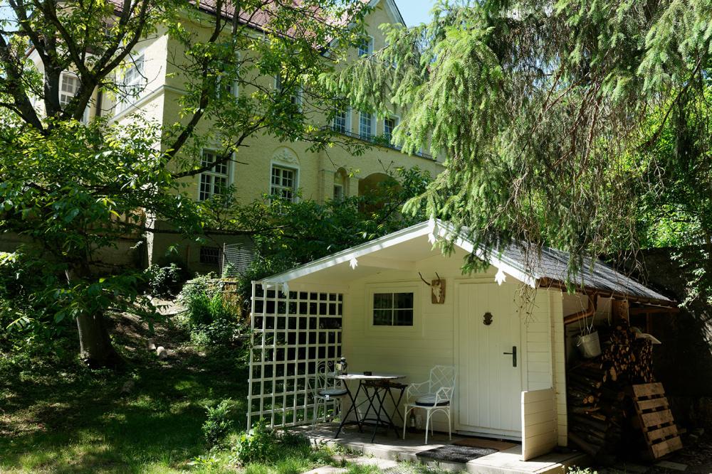 Sehr kleine, gut beheizbare Hütte mit kleiner überdachter Veranda, die mitten im traumhaften Garten steht. Von der Gartenhütte sind es 40 m zum Souterrain-Bereich des Haupthauses, wo man alle Sanitäranlagen und die große, perfekt ausgestattete Küche sowie den Hofladen vorfindet.