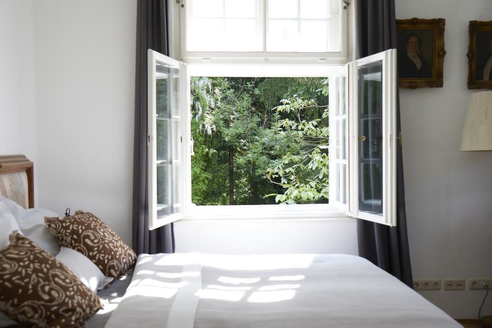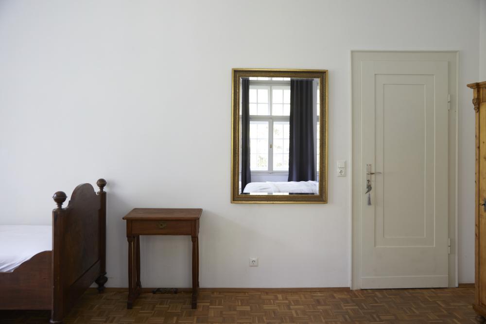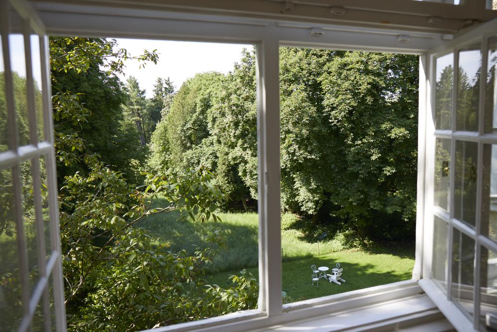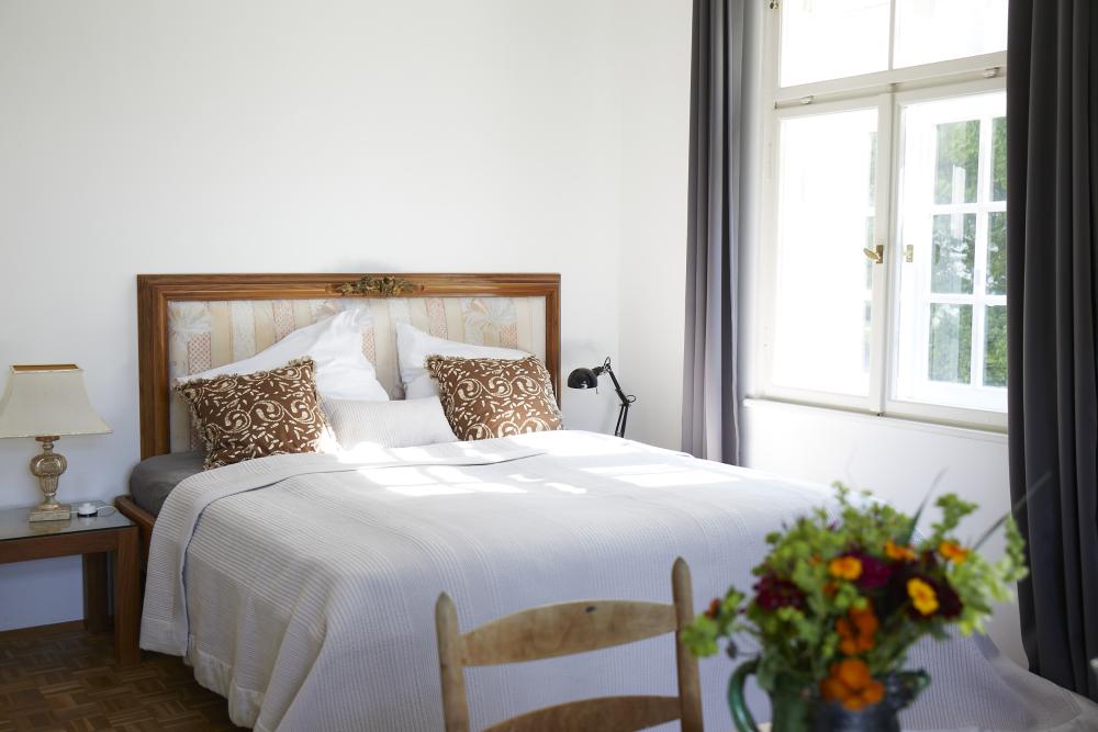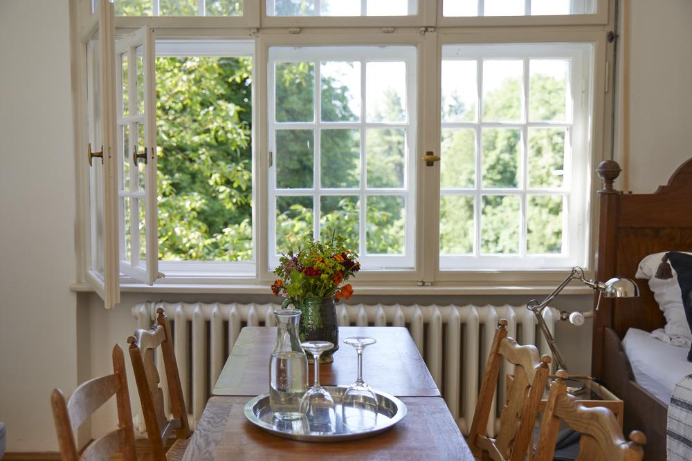 Das herrschaftlich anmutende, lichtdurchflutete Zimmer des ehemaligen „Künstlers des Hauses“ erhält seinen besonderen Charakter durch eine umlaufende Stuckleiste und den herrlichen Blick durch drei große Kastenfenster in den parkähnlichen Garten.